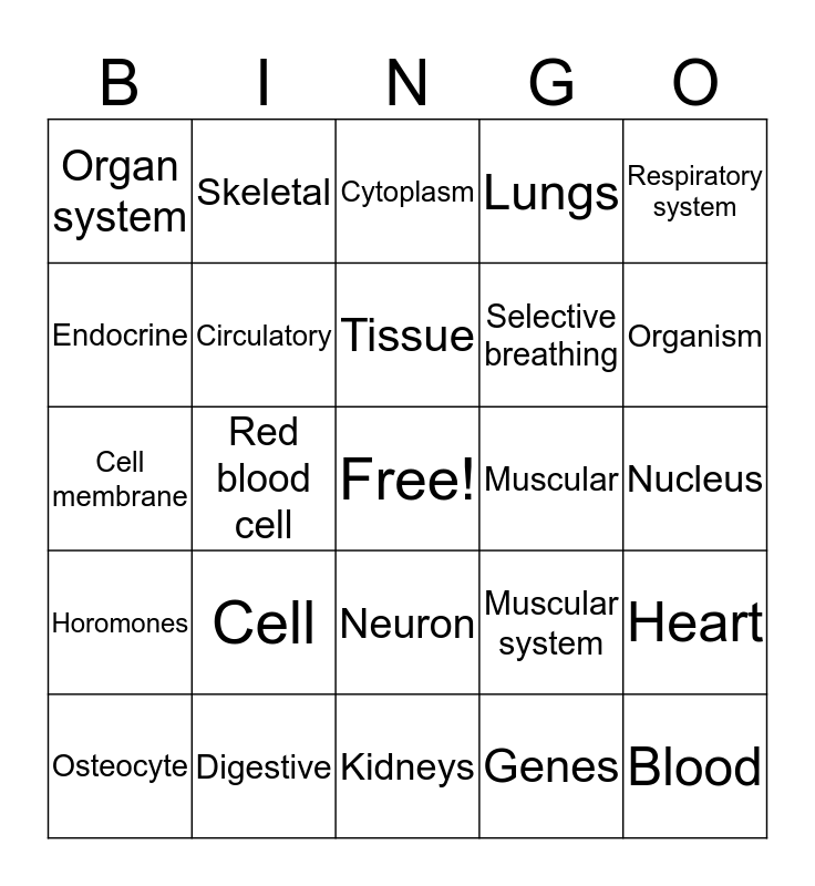 This bingo card has a free space and 24 words: Cell, Digestive, Tissue, Osteocyte, Respiratory system, Organ system, Endocrine, Skeletal, Muscular, Neuron, Selective breathing, Cell membrane, Muscular system, Heart, Circulatory, Genes, Nucleus, Cytoplasm, Organism, Red blood cell, Blood, Horomones, Lungs and Kidneys.