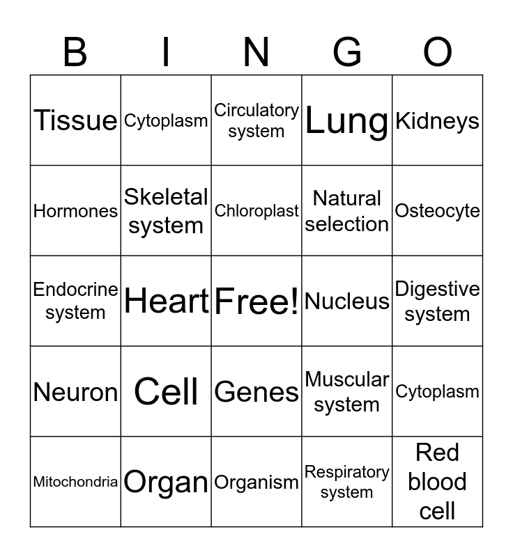 This bingo card has a free space and 24 words: Cell, Organ, Chloroplast, Mitochondria, Kidneys, Tissue, Hormones, Cytoplasm, Nucleus, Genes, Natural selection, Endocrine system, Muscular system, Cytoplasm, Skeletal system, Respiratory system, Digestive system, Circulatory system, Osteocyte, Heart, Red blood cell, Neuron, Lung and Organism.
