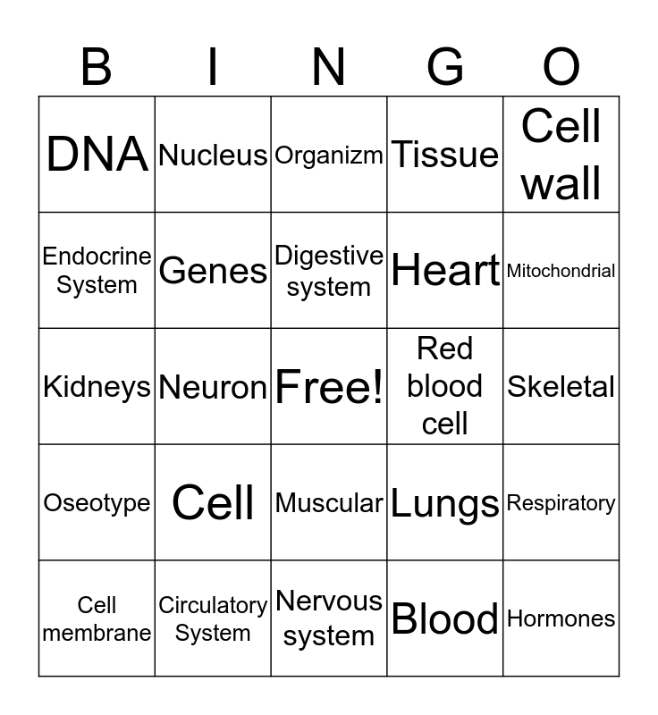 This bingo card has a free space and 24 words: Cell, Circulatory System, Digestive system, Cell membrane, Cell wall, DNA, Endocrine System, Nucleus, Red blood cell, Muscular, Heart, Kidneys, Lungs, Respiratory, Genes, Blood, Skeletal, Organizm, Mitochondrial, Neuron, Hormones, Oseotype, Tissue and Nervous system.