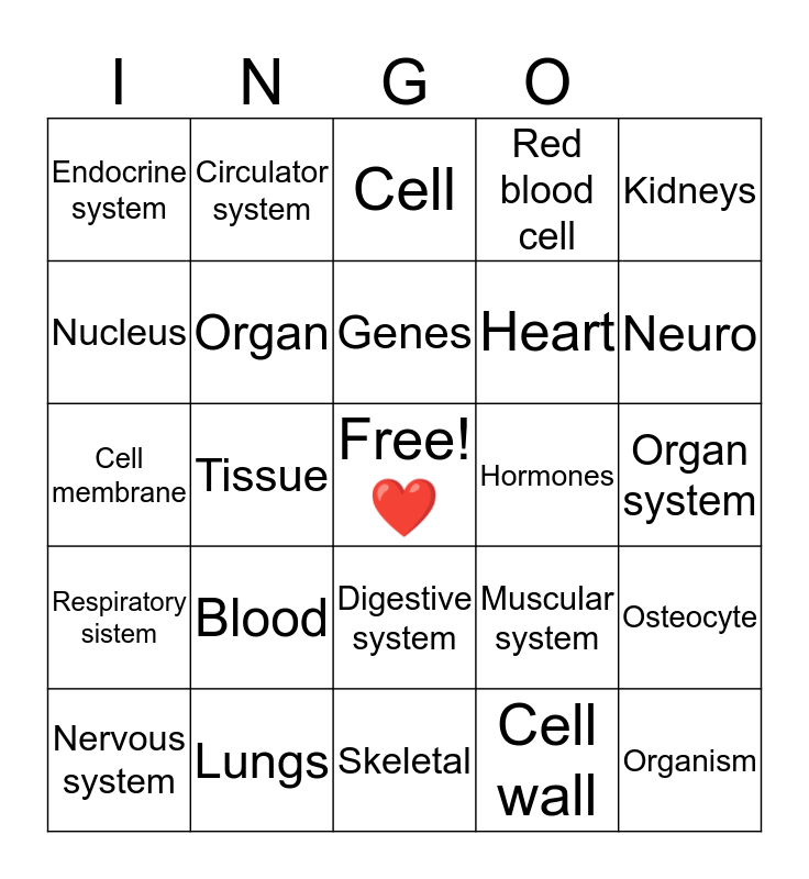 This bingo card has a free space and 24 words: Blood, Lungs, Genes, Nervous system, Kidneys, Endocrine system, Nucleus, Circulator system, Hormones, Digestive system, Heart, Cell membrane, Muscular system, Osteocyte, Organ, Cell wall, Organ system, Cell, Neuro, Tissue, Organism, Respiratory sistem, Red blood cell and Skeletal.