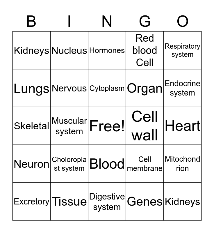 This bingo card has a free space and 24 words: Choloropla st system, Tissue, Cytoplasm, Excretory, Respiratory system, Kidneys, Lungs, Nucleus, Cell wall, Blood, Organ, Skeletal, Cell membrane, Mitochond rion, Nervous, Genes, Heart, Hormones, Endocrine system, Muscular system, Kidneys, Neuron, Red blood Cell and Digestive system.