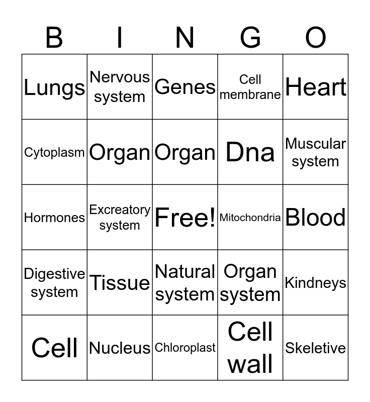 This bingo card has a free space and 24 words: Cell, Tissue, Organ, Cell wall, Heart, Lungs, Nervous system, Genes, Mitochondria, Blood, Hormones, Organ, Organ system, Kindneys, Cytoplasm, Nucleus, Chloroplast, Cell membrane, Muscular system, Digestive system, Excreatory system, Natural system, Dna and Skeletive.