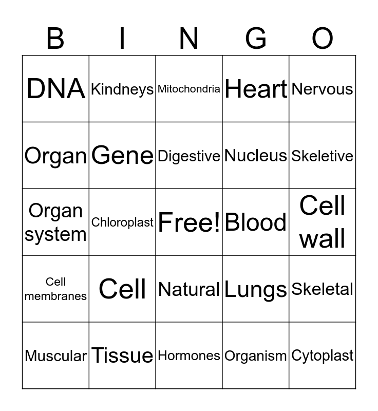 This bingo card has a free space and 24 words: Cell, Tissue, Digestive, Muscular, Nervous, DNA, Organ, Kindneys, Blood, Natural, Nucleus, Organ system, Lungs, Skeletal, Gene, Organism, Cell wall, Mitochondria, Skeletive, Chloroplast, Cytoplast, Cell membranes, Heart and Hormones.