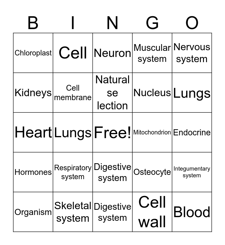 This bingo card has a free space and 24 words: Respiratory system, Skeletal system, Natural se lection, Organism, Nervous system, Chloroplast, Kidneys, Cell, Mitochondrion, Digestive system, Nucleus, Heart, Osteocyte, Integumentary system, Cell membrane, Cell wall, Endocrine, Neuron, Lungs, Lungs, Blood, Hormones, Muscular system and Digestive system.