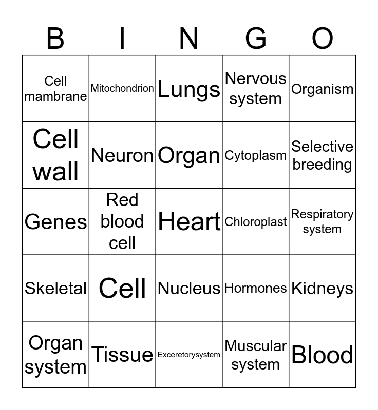This bingo card has a free space and 24 words: Cell, Tissue, Organ, Organ system, Organism, Cell mambrane, Cell wall, Mitochondrion, Chloroplast, Nucleus, Cytoplasm, Genes, Hormones, Kidneys, Neuron, Muscular system, Respiratory system, Lungs, Selective breeding, Red blood cell, Blood, Skeletal, Nervous system and Exceretorysystem.