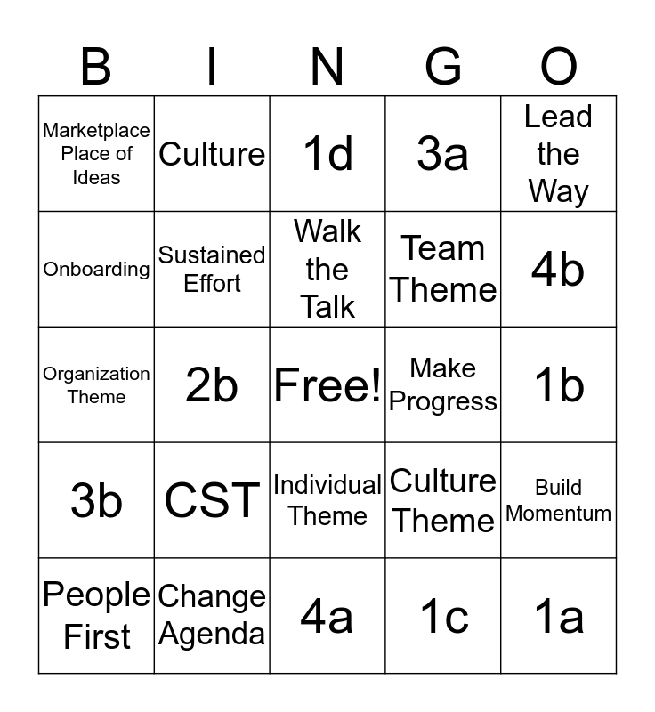 This bingo card has a free space and 24 words: CST, Change Agenda, Walk the Talk, People First, Lead the Way, Marketplace Place of Ideas, Onboarding, Culture, Make Progress, Individual Theme, Team Theme, Organization Theme, Culture Theme, Build Momentum, Sustained Effort, 1c, 1b, 1d, 4b, 2b, 1a, 3b, 3a and 4a.