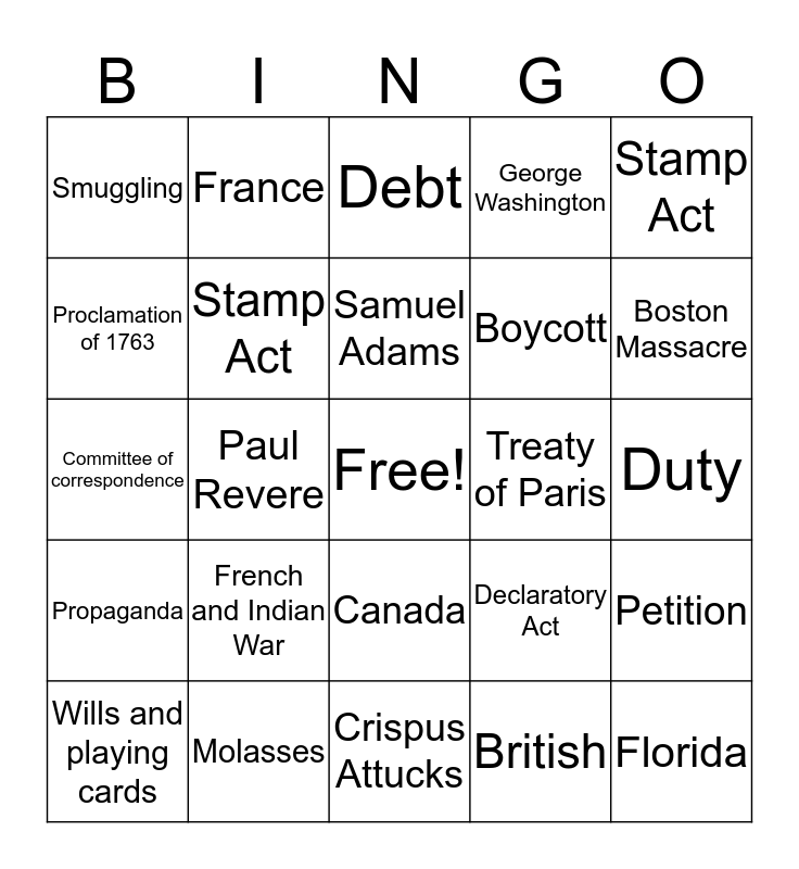 This bingo card has a free space and 25 words: French and Indian War, Crispus Attucks, Samuel Adams, Wills and playing cards, Stamp Act, Smuggling, Proclamation of 1763, France, Treaty of Paris, Canada, Boycott, Committee of correspondence, Declaratory Act, Petition, Stamp Act, Writs of Assistance, Duty, Debt, Boston Massacre, Paul Revere, Florida, Molasses, Propaganda, George Washington and British.