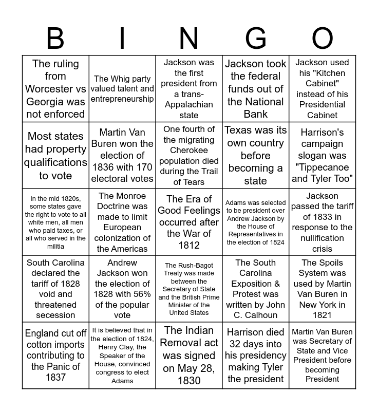 This bingo card has 26 words: The Rush-Bagot Treaty was made between the Secretary of State and the British Prime Minister of the United States, Harrison died 32 days into his presidency making Tyler the president, One fourth of the migrating Cherokee population died during the Trail of Tears, It is believed that in the election of 1824, Henry Clay, the Speaker of the House, convinced congress to elect Adams, Jackson used his "Kitchen Cabinet" instead of his Presidential Cabinet, The ruling from Worcester vs Georgia was not enforced, Most states had property qualifications to vote, The Whig party valued talent and entrepreneurship, Jackson passed the tariff of 1833 in response to the nullification crisis, The South Carolina Exposition & Protest was written by John C. Calhoun, Texas was its own country before becoming a state, In the mid 1820s, some states gave the right to vote to all white men, all men who paid taxes, or all who served in the militia, The Spoils System was used by Martin Van Buren in New York in 1821, England cut off cotton imports contributing to the Panic of 1837, The Monroe Doctrine was made to limit European colonization of the Americas, John Quincy Adams was the president from 1825 - 1829, Jackson took the federal funds out of the National Bank, South Carolina declared the tariff of 1828 void and threatened secession, Jackson was the first president from a trans-Appalachian state, The Era of Good Feelings occurred after the War of 1812, Harrison's campaign slogan was "Tippecanoe and Tyler Too", The Indian Removal act was signed on May 28, 1830, Adams was selected to be president over Andrew Jackson by the House of Representatives in the election of 1824, Andrew Jackson won the election of 1828 with 56% of the popular vote, Martin Van Buren won the election of 1836 with 170 electoral votes and Martin Van Buren was Secretary of State and Vice President before becoming President.