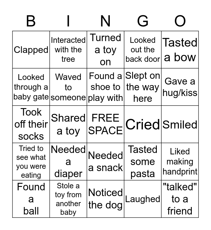 This bingo card has a free space and 24 words: Needed a diaper, Stole a toy from another baby, Found a shoe to play with, Found a ball, Tasted a bow, Clapped, Looked through a baby gate, Interacted with the tree, Cried, Needed a snack, Slept on the way here, Took off their socks, Tasted some pasta, Liked making handprint, Waved to someone, Laughed, Smiled, Turned a toy on, Gave a hug/kiss, Shared a toy, "talked" to a friend, Tried to see what you were eating, Looked out the back door and Noticed the dog.