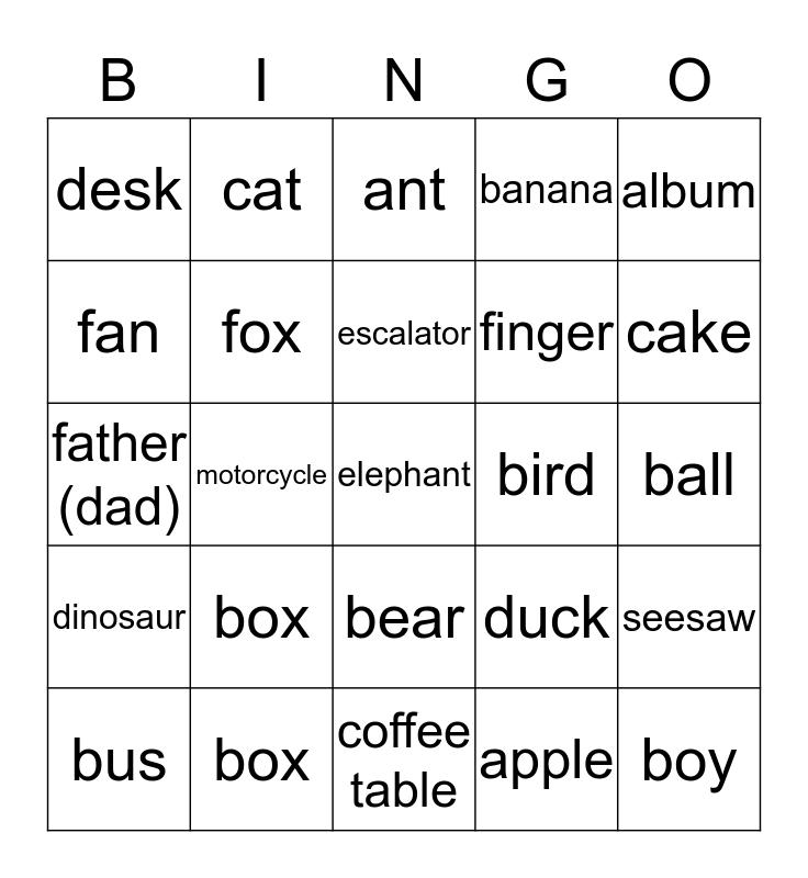 This bingo card has a free space and 44 words: girl, boy, bag, bus, dog, apple, ant, alligator, album, box, banana, bird, bear, box, sofa, coffee table, doll, father (dad), cup, cake, cat, car, cow, desk, pineapple, ball, kite, dog, duck, dinosaur, cap, seesaw, slide, swings, motorcycle, egg, elbow, kitten, escalator, fan, finger, fish, fox and Free!.