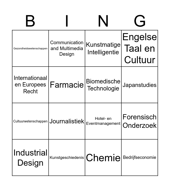 This bingo card has 62 words: Free!, Accountancy, Archeologie, Bedrijfseconomie, Bestuurskunde, Bewegingswetenschappen, Biomedische Technologie, Chinastudies, Cultuurwetenschappen, Diergeneeskunde, Engelse Taal en Cultuur, Europese Studies, Farmacie, Fiscaal Recht, Geneeskunde, Gezondheidswetenschappen, Industrial Design, Internationaal en Europees Recht, Internationale Betrekkingen en Internationale Organisatie, Japanstudies, Kunstgeschiedenis, Kunstmatige Intelligentie, Life Science and Technology, Maritieme Techniek, Medische Natuurwetenschappen, Natuur- en Sterrenkunde, Onderwijskunde, Pedagogische Wetenschappen, Sociologie, Tandheelkunde, Technische Wiskunde, Aviation, Biotechnologie, Built Environment, Chemie, Communication and Multimedia Design, Dier- en Veehouderij, Facility Management, Forensisch Onderzoek, HBO - Rechten, Hotel- en Eventmanagement, Informatica, Integrale Veiligheidskunde, International Food & Agribusiness, Journalistiek, Lerarenopleiding 2e graad Natuurkunde, Luchtvaarttechnologie, Maritiem Officier, Mondzorgkunde, Ocean Technology, Pedagogiek, Rechten, Social Work, Sportkunde, Technische Bedrijfskunde, Vastgoed en Makelaardij, Verloskunde, Verpleegkunde, Vertaler Engels, Voeding en Diëtetiek, Watermanagement and Werktuigbouwkunde.