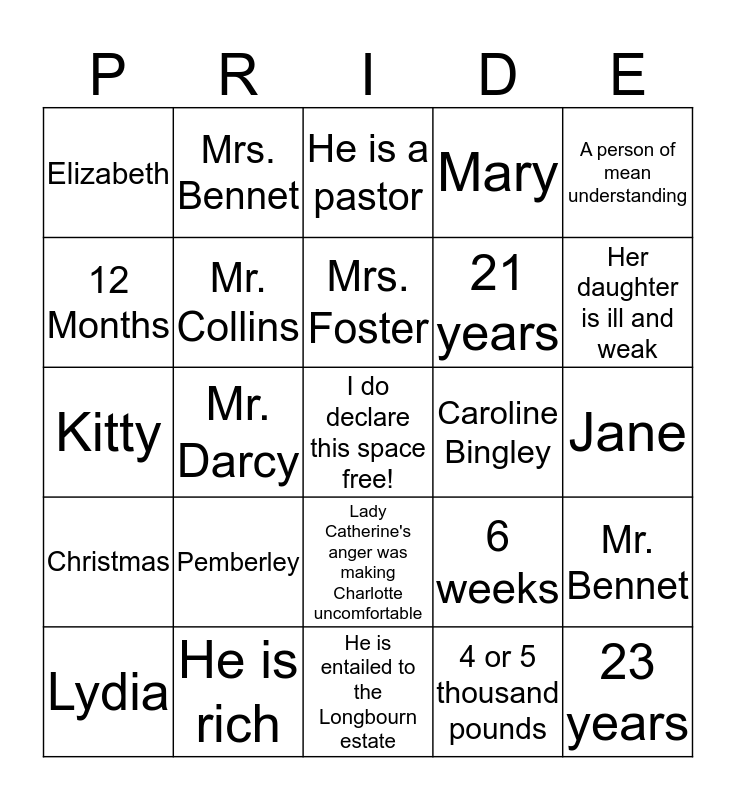 This bingo card has a free space and 40 words: Louisa, Kitty, 27 years, Mr. Collins, He is rich, Lady Catherine's anger was making Charlotte uncomfortable, Mrs. Foster, Sarcastic, A person of mean understanding, Christmas, Mr. Darcy, Mary, 23 years, Jane, Caroline Bingley, Pemberley, She becomes sick, Elizabeth, Mr. Bingley, He is a pastor, Mr. Bennet, 4 or 5 thousand pounds, 21 years, 12 Months, Mrs. Foster, Mrs. Gardiner, Jane, Jane Austen, 6 weeks, Mr. Wickham, Mrs. Gardiner, Lydia, Jane Austen, 6 weeks, Her daughter is ill and weak, He is entailed to the Longbourn estate, Lady Catherine de Bourgh, Georgiana Darcy, Mrs. Bennet and 1 thousand pounds.