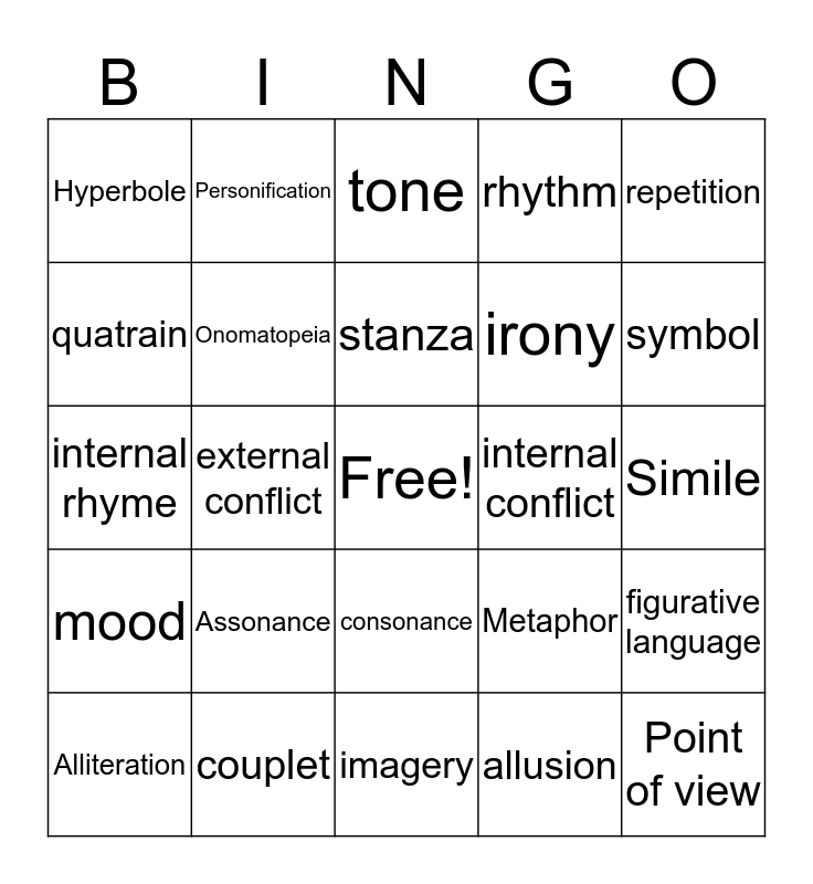 This bingo card has a free space and 24 words: Assonance, couplet, stanza, Alliteration, repetition, Hyperbole, quatrain, Personification, internal conflict, consonance, irony, internal rhyme, Metaphor, figurative language, Onomatopeia, allusion, Simile, tone, symbol, external conflict, Point of view, mood, rhythm and imagery.