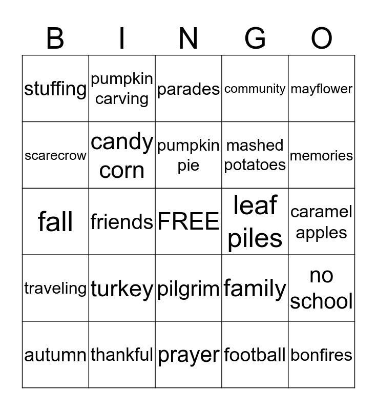This bingo card has a free space and 24 words: turkey, thankful, pumpkin pie, autumn, mayflower, stuffing, scarecrow, pumpkin carving, leaf piles, pilgrim, mashed potatoes, fall, family, no school, candy corn, football, caramel apples, parades, memories, friends, bonfires, traveling, community and prayer.