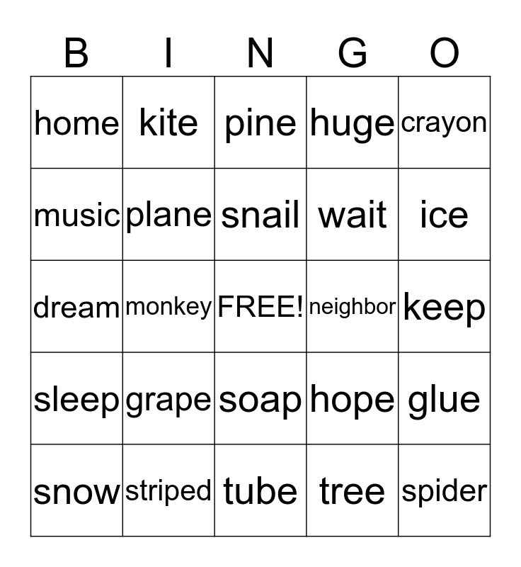 This bingo card has a free space and 24 words: grape, striped, snail, snow, crayon, home, music, kite, neighbor, soap, wait, dream, hope, glue, plane, tree, keep, pine, ice, monkey, spider, sleep, huge and tube.