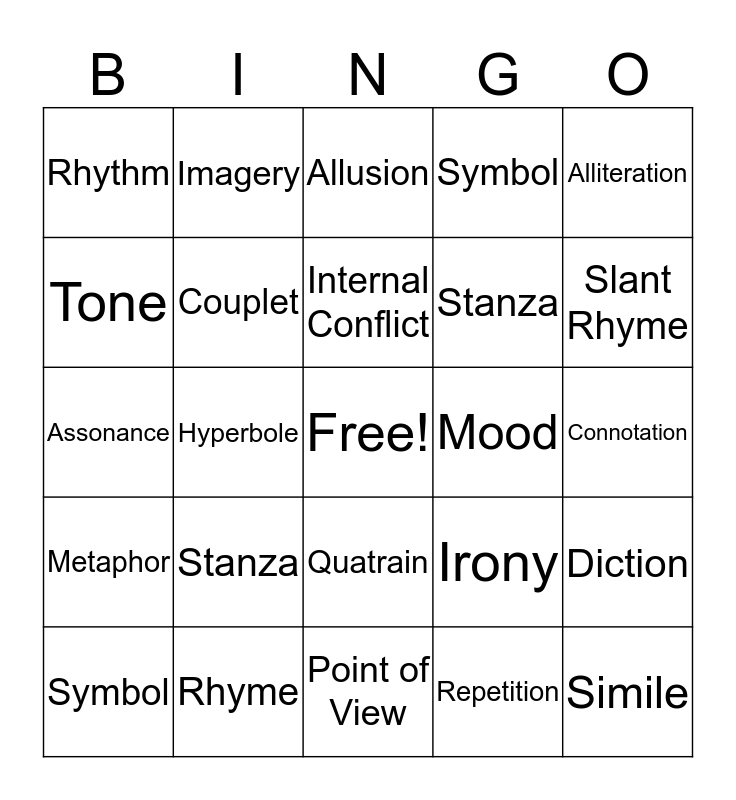 This bingo card has a free space and 24 words: Stanza, Rhyme, Internal Conflict, Symbol, Alliteration, Rhythm, Tone, Imagery, Mood, Quatrain, Stanza, Assonance, Irony, Diction, Couplet, Repetition, Connotation, Allusion, Slant Rhyme, Hyperbole, Simile, Metaphor, Symbol and Point of View.