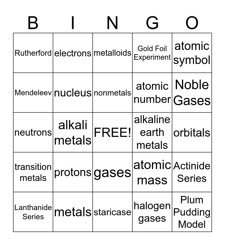 This bingo card has a free space and 24 words: protons, metals, nonmetals, Lanthanide Series, atomic symbol, Rutherford, Mendeleev, electrons, alkaline earth metals, gases, atomic number, neutrons, atomic mass, Actinide Series, nucleus, halogen gases, orbitals, metalloids, Noble Gases, alkali metals, Plum Pudding Model, transition metals, Gold Foil Experiment and staricase.