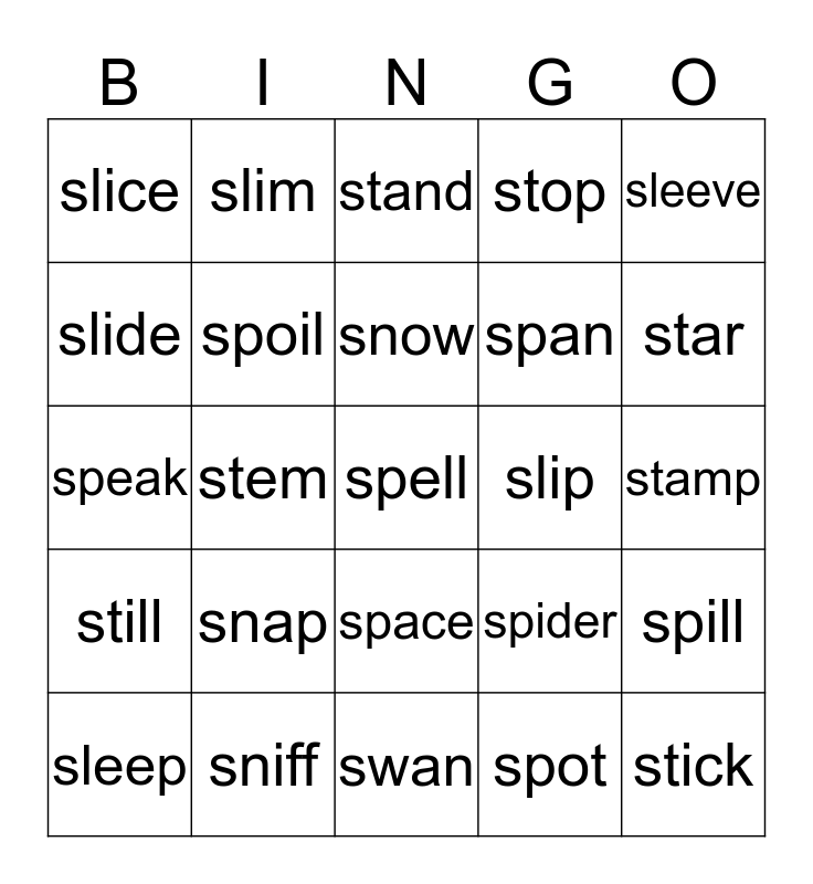 This bingo card has a free space and 24 words: snap, sniff, snow, sleep, sleeve, slice, slide, slim, slip, space, span, speak, spider, spill, spoil, spot, stamp, stand, star, stem, stick, still, stop and swan.