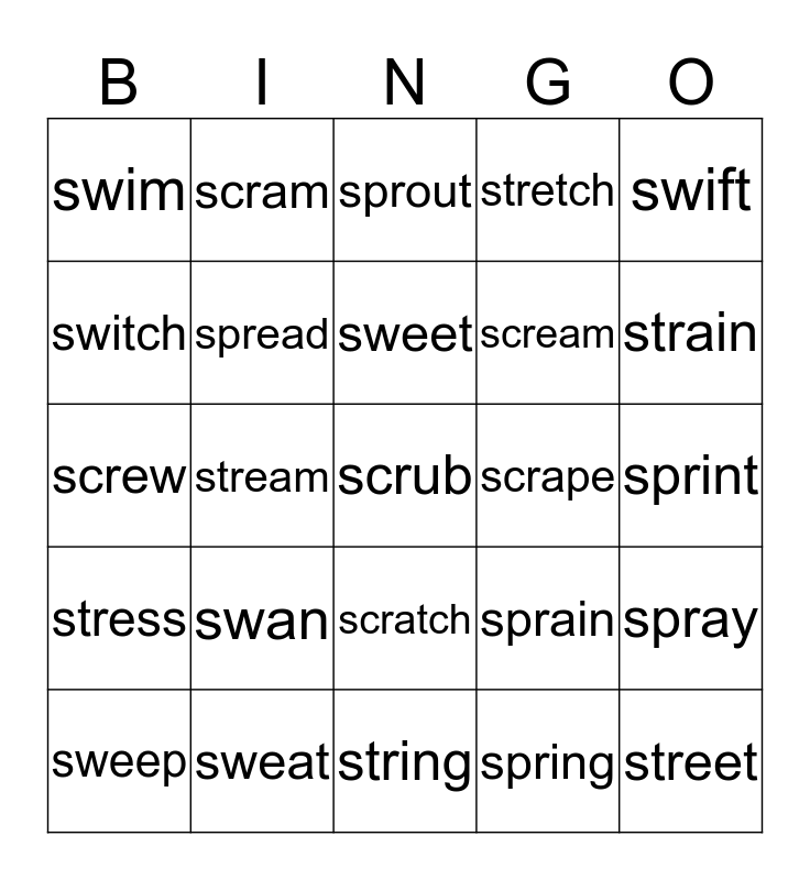 This bingo card has a free space and 24 words: swan, sweat, sweet, sweep, swift, swim, switch, scram, scrape, scratch, scream, screw, sprain, spray, spread, spring, sprint, sprout, strain, stream, street, stress, stretch and string.