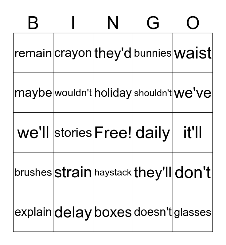 This bingo card has a free space and 24 words: strain, delay, holiday, explain, waist, remain, maybe, crayon, daily, haystack, shouldn't, we'll, they'll, don't, wouldn't, doesn't, it'll, they'd, we've, stories, glasses, brushes, bunnies and boxes.