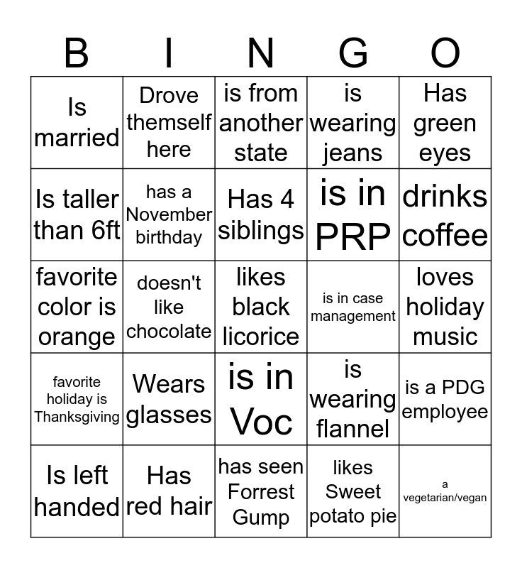 This bingo card has a free space and 24 words: Wears glasses, Has red hair, Has 4 siblings, Is left handed, Has green eyes, Is married, Is taller than 6ft, Drove themself here, is in case management, is in Voc, is in PRP, favorite color is orange, is wearing flannel, is a PDG employee, has a November birthday, likes Sweet potato pie, loves holiday music, is from another state, drinks coffee, doesn't like chocolate, a vegetarian/vegan, favorite holiday is Thanksgiving, is wearing jeans and has seen Forrest Gump.