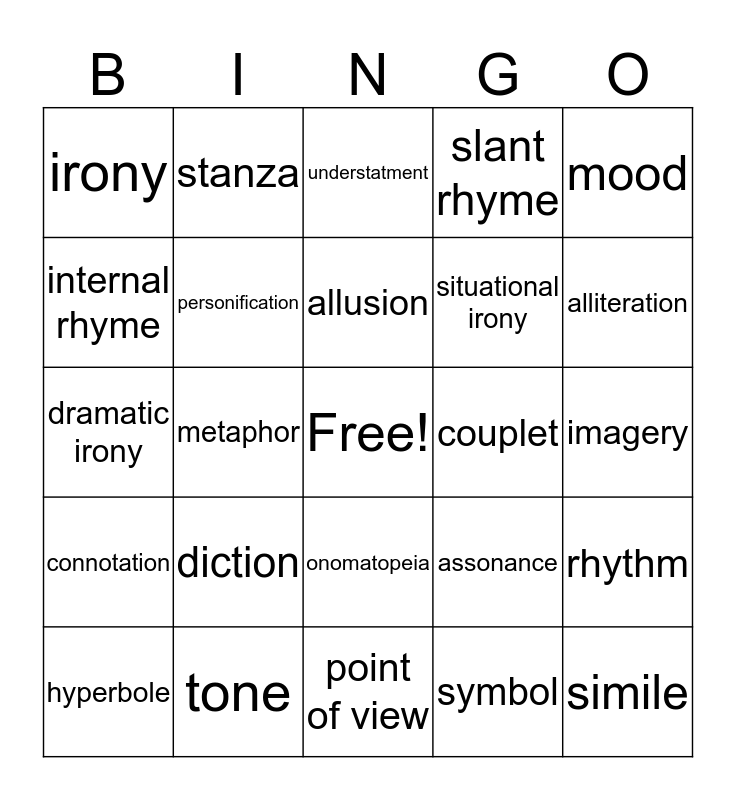 This bingo card has a free space and 24 words: diction, tone, allusion, hyperbole, mood, irony, internal rhyme, stanza, couplet, onomatopeia, situational irony, dramatic irony, assonance, rhythm, personification, symbol, imagery, understatment, alliteration, metaphor, simile, connotation, slant rhyme and point of view.