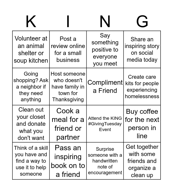 This bingo card has 16 words: Pass an inspiring book on to a friend, Buy coffee for the next person in line, Say something positive to everyone you meet, Volunteer at an animal shelter or soup kitchen, Clean out your closet and donate what you don't want, Post a review online for a small business, Attend the KING #GivingTuesday Event, Surprise someone with a handwritten note of encouragement, Going shopping? Ask a neighbor if they need anything, Host someone who doesn't have family in town for Thanksgiving, Think of a skill you have and find a way to use it to help someone, Share an inspiring story on social media today, Cook a meal for a friend or partner, Create care kits for people experiencing homelessness, Compliment a Friend and Get together with some friends and organize a clean up.