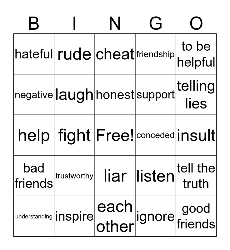 This bingo card has a free space and 24 words: trustworthy, inspire, honest, understanding, to be helpful, hateful, negative, rude, conceded, liar, support, help, listen, tell the truth, laugh, ignore, insult, cheat, telling lies, fight, good friends, bad friends, friendship and each other.