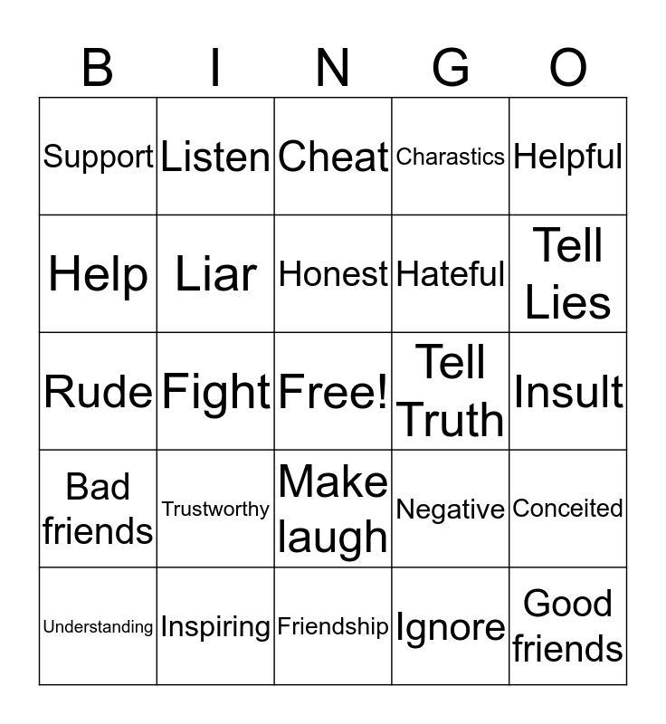 This bingo card has a free space and 24 words: Trustworthy, Inspiring, Honest, Understanding, Helpful, Support, Help, Listen, Tell Truth, Make laugh, Hateful, Rude, Negative, Conceited, Liar, Ignore, Insult, Cheat, Tell Lies, Fight, Good friends, Bad friends, Charastics and Friendship.