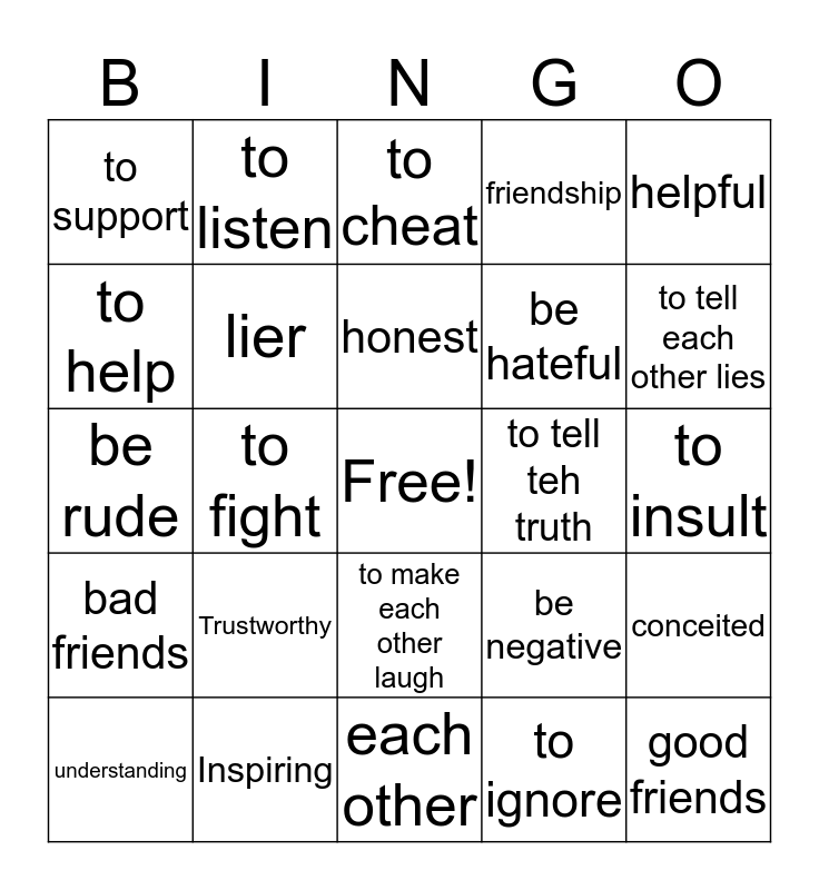 This bingo card has a free space and 24 words: Trustworthy, Inspiring, honest, understanding, helpful, to support, to help, to listen, to tell teh truth, to make each other laugh, be hateful, be rude, be negative, conceited, lier, to ignore, to insult, to cheat, to tell each other lies, to fight, good friends, bad friends, friendship and each other.