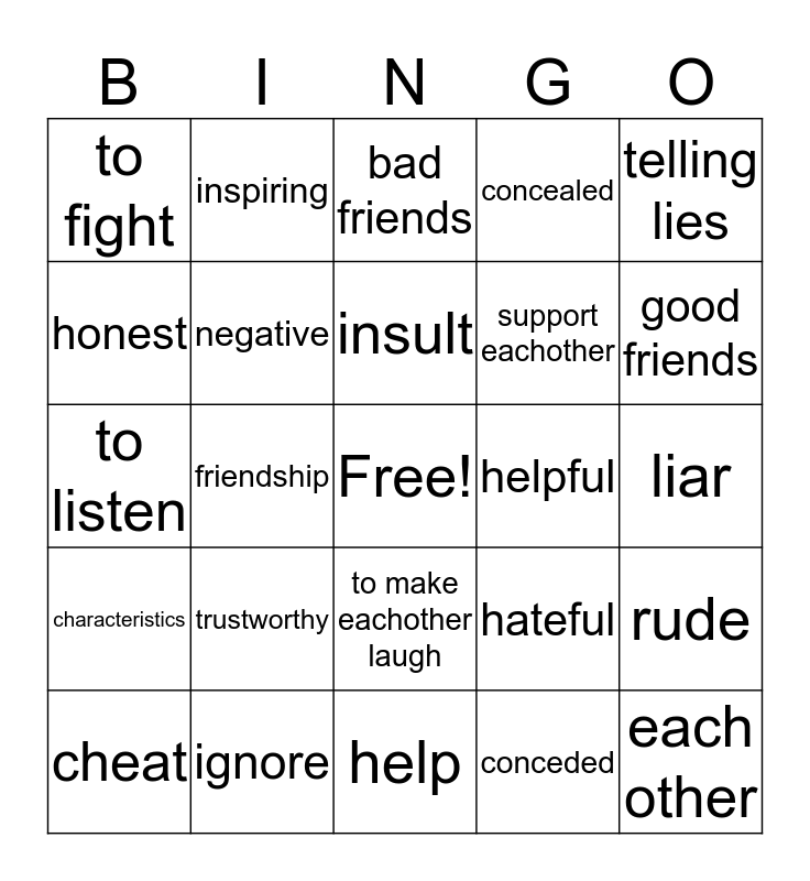 This bingo card has a free space and 24 words: trustworthy, ignore, insult, cheat, telling lies, to fight, honest, inspiring, helpful, to make eachother laugh, support eachother, to listen, hateful, rude, negative, conceded, liar, bad friends, good friends, friendship, each other, characteristics, concealed and help.
