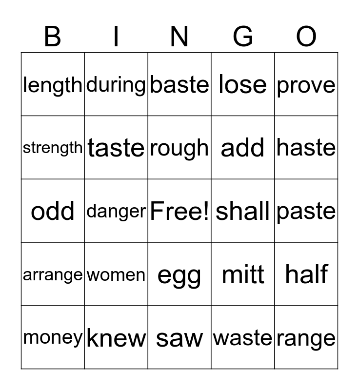 This bingo card has a free space and 24 words: women, knew, rough, money, prove, length, strength, during, shall, egg, add, odd, mitt, half, taste, waste, paste, baste, haste, danger, range, arrange, lose and saw.