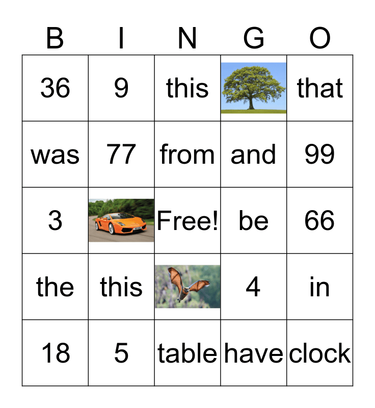 This bingo card has 3 images, a free space and 21 words: this, 5, from, 18, that, 36, was, 9, be, and, 3, 4, in, 77, have, 66, this, 99, clock, the and table.