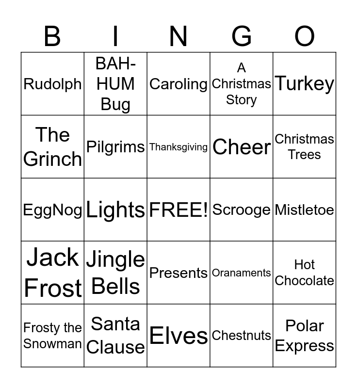 This bingo card has a free space and 24 words: Jingle Bells, Santa Clause, Thanksgiving, Frosty the Snowman, Turkey, Rudolph, The Grinch, BAH-HUM Bug, Scrooge, Presents, Cheer, EggNog, Oranaments, Hot Chocolate, Pilgrims, Chestnuts, Mistletoe, Caroling, Christmas Trees, Lights, Polar Express, Jack Frost, A Christmas Story and Elves.