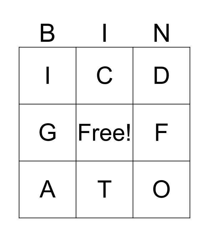 This bingo card has a free space and 10 words: A, C, D, G, I, S, F, L, T and O.