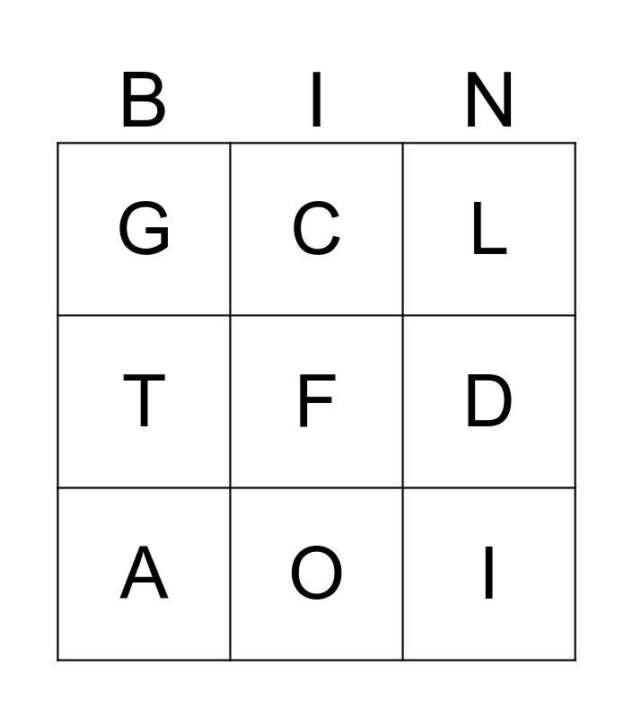 This bingo card has a free space and 9 words: A, C, D, G, L, T, O, I and S.