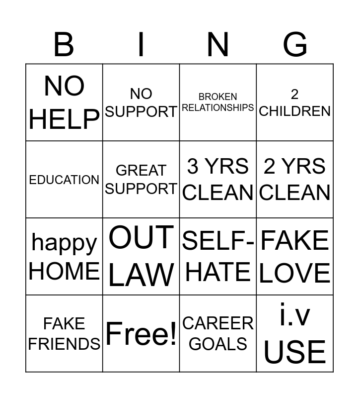 This bingo card has 28 words: DUI, NEGATIVE PEOPLE, happy HOME, BROKEN HOME, GREAT SUPPORT, BROKEN RELATIONSHIPS, NO SUPPORT, i.v USE, Free!, 3-CHILDREN, SELF-HATE, 2 CHILDREN, LACK OF LOVE, JAIL TIME, OUT LAW, INPATIENT, FULL OF LOVE, 3 YRS CLEAN, 2 YRS CLEAN, HELP WANTED, NO HELP, MONEY PROBLEMS, FAKE FRIENDS, FAKE LOVE, CAREER GOALS, NO CAREER GOALS, EDUCATION and MENTAL HEALTH.