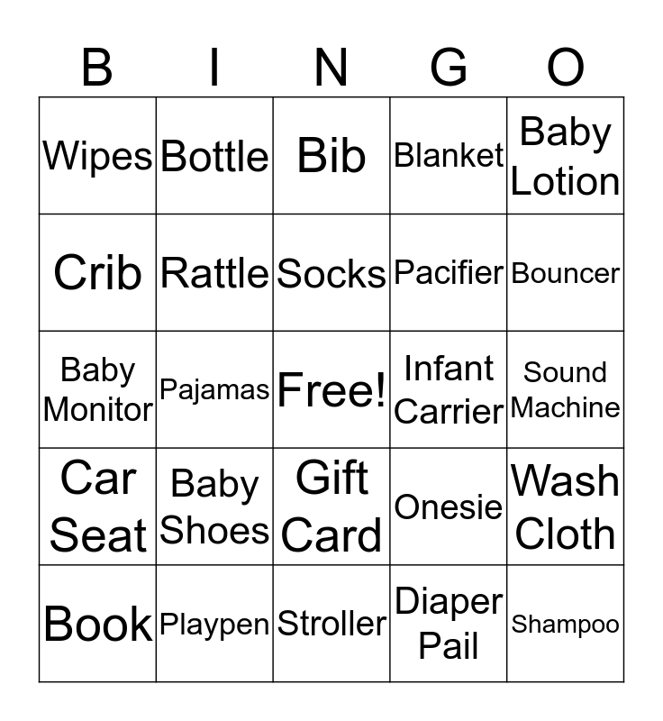 This bingo card has a free space and 27 words: Onesie, Diaper, Pacifier, Stroller, Crib, Bib, Bottle, Car Seat, Infant Carrier, Wash Cloth, Baby Monitor, Blanket, Book, Playpen, Bouncer, Stuffed Animal, Rattle, Socks, Baby Shoes, Wipes, Sound Machine, Diaper Pail, Pajamas, Shampoo, Gift Card, Baby Lotion and Thermometer.