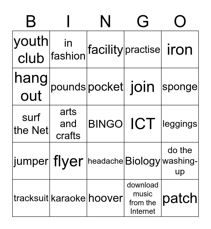 This bingo card has a free space and 24 words: flyer, karaoke, pocket, tracksuit, iron, youth club, hang out, in fashion, ICT, headache, join, surf the Net, Biology, do the washing-up, pounds, download music from the Internet, leggings, facility, sponge, arts and crafts, patch, jumper, practise and hoover.