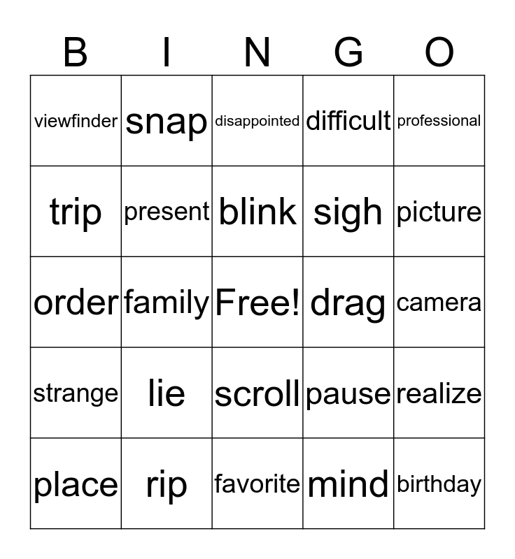 This bingo card has a free space and 24 words: lie, rip, blink, place, professional, viewfinder, trip, snap, drag, scroll, sigh, order, pause, realize, present, mind, camera, disappointed, picture, family, birthday, strange, difficult and favorite.