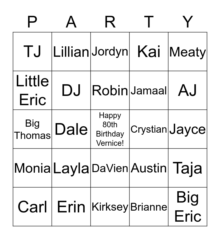 This bingo card has a free space and 24 words: Layla, Erin, Robin, Carl, Meaty, TJ, Little Eric, Lillian, Crystian, DaVien, Jamaal, Big Thomas, Austin, Taja, DJ, Brianne, Jayce, Jordyn, AJ, Dale, Big Eric, Monia, Kai and Kirksey.