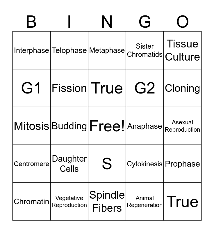 This bingo card has a free space and 24 words: Daughter Cells, Vegetative Reproduction, True, Chromatin, Tissue Culture, Interphase, G1, Telophase, Anaphase, S, G2, Mitosis, Cytokinesis, Prophase, Fission, Animal Regeneration, Asexual Reproduction, Metaphase, Cloning, Budding, True, Centromere, Sister Chromatids and Spindle Fibers.