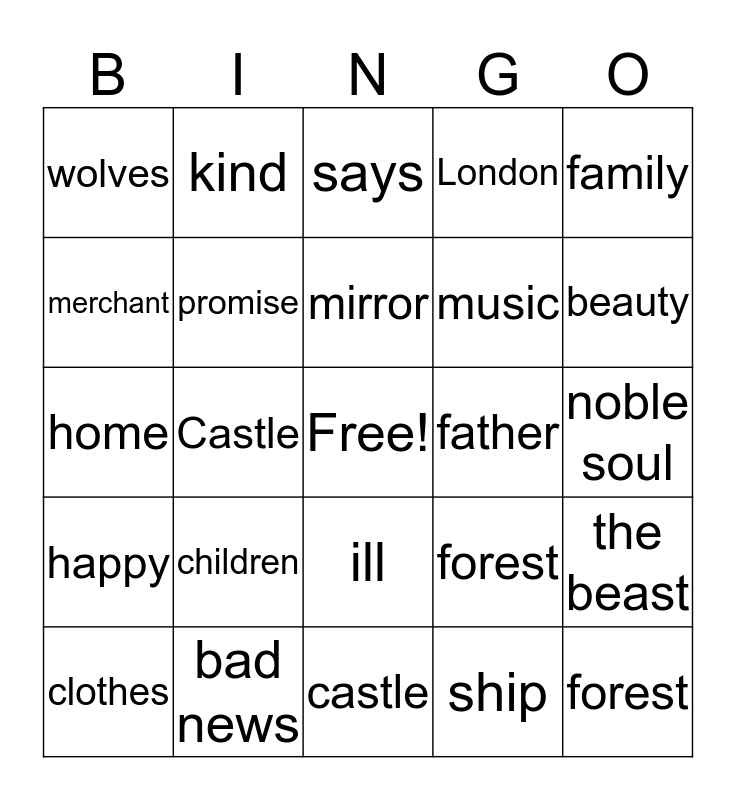 This bingo card has a free space and 34 words: marriage, ship, port, visit, happy, promise, family, clothes, kind, sisters, mirror, says, rose, bride, father, beauty, bad news, home, children, forest, ill, fireplace, wolves, noble soul, castle, forest, London, Airplane, music, merchant, dauhter, Castle, the beast and dream.