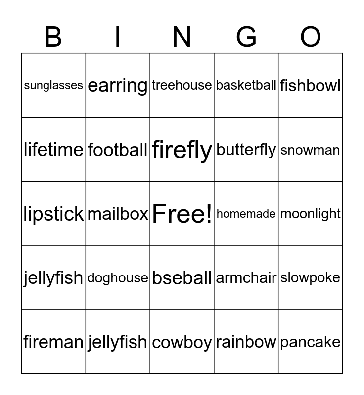 This bingo card has a free space and 24 words: doghouse, jellyfish, firefly, fireman, fishbowl, sunglasses, lifetime, earring, homemade, bseball, butterfly, lipstick, armchair, slowpoke, football, rainbow, moonlight, treehouse, snowman, mailbox, pancake, jellyfish, basketball and cowboy.