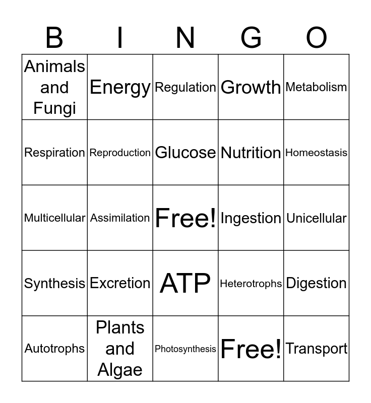 This bingo card has a free space and 24 words: Excretion, Plants and Algae, Glucose, Autotrophs, Metabolism, Animals and Fungi, Respiration, Energy, Ingestion, ATP, Nutrition, Multicellular, Heterotrophs, Digestion, Reproduction, Free!, Unicellular, Regulation, Homeostasis, Assimilation, Transport, Synthesis, Growth and Photosynthesis.