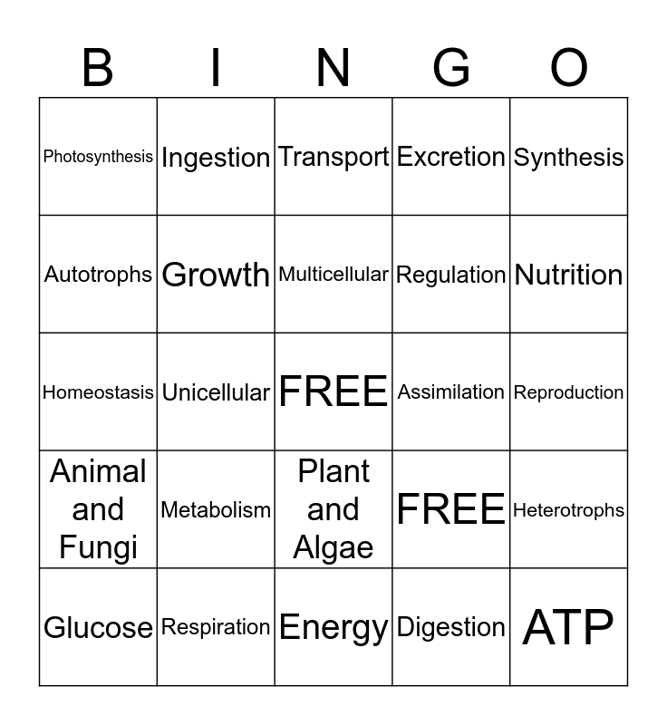 This bingo card has a free space and 24 words: Metabolism, Respiration, Multicellular, Glucose, Synthesis, Photosynthesis, Autotrophs, Ingestion, Assimilation, Plant and Algae, Regulation, Homeostasis, FREE, Heterotrophs, Growth, Digestion, Reproduction, Transport, Nutrition, Unicellular, ATP, Animal and Fungi, Excretion and Energy.