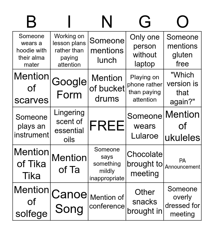 This bingo card has a free space and 29 words: Mention of solfege, Someone has a smoothie, Lingering scent of essential oils, Mention of Music K-8 Magazine, Someone wears a hoodie with their alma mater, Someone mentions lunch, Google Form, Mention of Ta, Someone wears Lularoe, Canoe Song, Mention of ukuleles, Someone overly dressed for meeting, Mention of conference, Other snacks brought in, "Which version is that again?", Mention of another music teacher not present, Someone says something mildly inappropriate, Mention of Tika Tika, Someone mentions gluten free, Someone plays an instrument, Chocolate brought to meeting, Mention of circle rug, Playing on phone rather than paying attention, Mention of scarves, Only one person without laptop, Working on lesson plans rather than paying attention, PA Announcement, Mention of bucket drums and Power or Internet Outage.