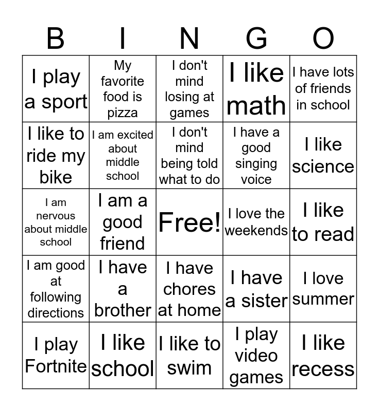 This bingo card has a free space and 24 words: I have a brother, I like school, I don't mind being told what to do, I play Fortnite, I have lots of friends in school, I play a sport, I like to ride my bike, My favorite food is pizza, I love the weekends, I have chores at home, I have a good singing voice, I am nervous about middle school, I have a sister, I love summer, I am excited about middle school, I play video games, I like to read, I don't mind losing at games, I like science, I am a good friend, I like recess, I am good at following directions, I like math and I like to swim.