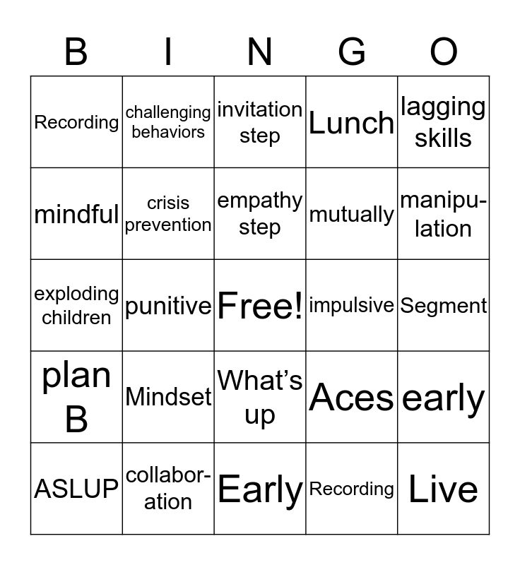 This bingo card has a free space and 34 words: Ross Greene, Recording, Segment, unsolved problems, plan B, crisis prevention, lagging skills, ASLUP, challenging behaviors, illogical conse-quences, empathy step, invitation step, proactive, problem solving plan, impulsive, manipu-lation, collabor-ation, exploding children, Mindset, Aces, What’s up, Ross, Recording, Segment, Early, Live, Lunch, Minimize damage, mutually, mindful, Nuts & Bolts, punitive, early and late.
