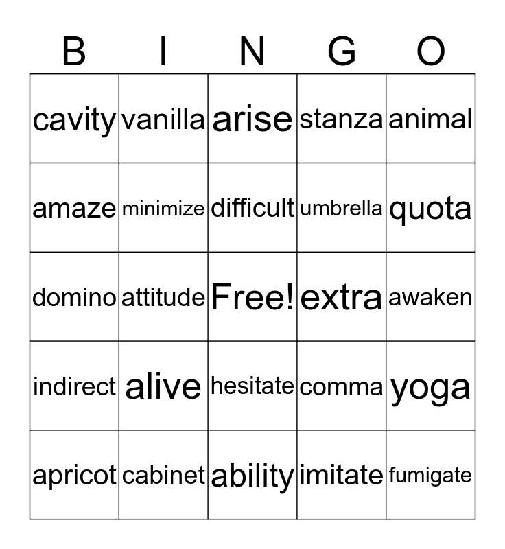 This bingo card has a free space and 24 words: alive, cabinet, difficult, apricot, animal, cavity, amaze, vanilla, extra, hesitate, umbrella, domino, comma, yoga, minimize, imitate, awaken, arise, quota, attitude, fumigate, indirect, stanza and ability.